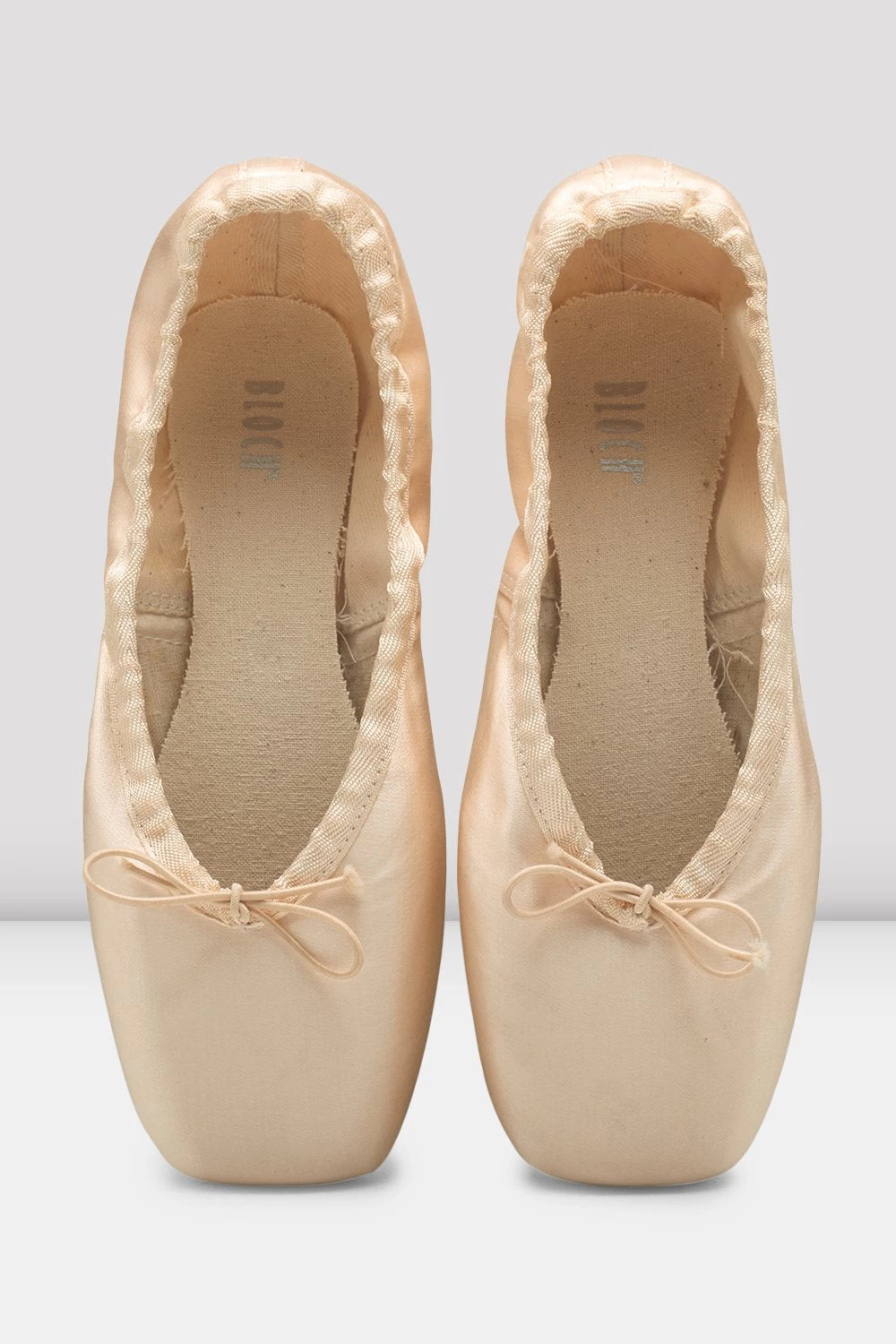 - Slightly V shaped vamp and shallow box (which gently curves at the sides) support the toes laterally and keep the foot in correct alignment en pointe