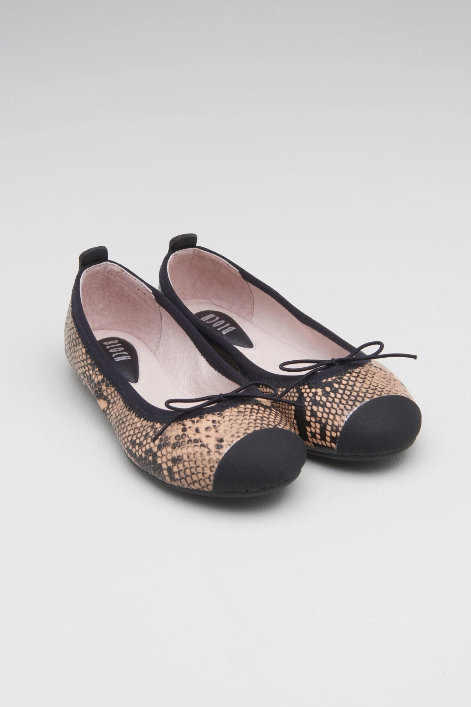 Our Girls Astra Ballet Flats feature a classic two tone design with a sleek and sophisticated python print with a semi-gloss finish. Crafted for all day comfort, our Ballet Flats are the perfect shoe for on the go with its cushioned teardrop heel and elasticated drawstring allowing for a customisable fit.
