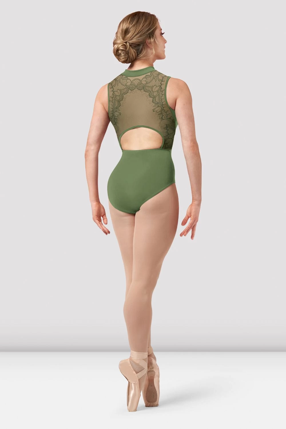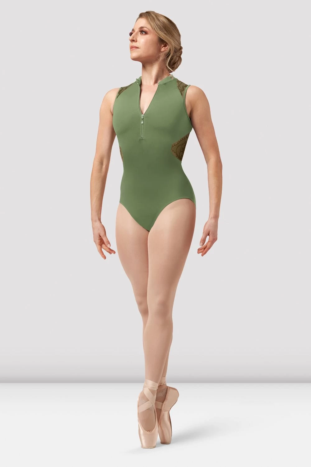 Our Ladies Harper Zip Front Leotard features a mock neck with zipper front and a mesh cut-out back. Part of our BLOCH Lace collection featuring delicate lace prints, mesh detailing and beautifully cut silhouettes. This collection boasts elegance, available in a trio of rich tones.