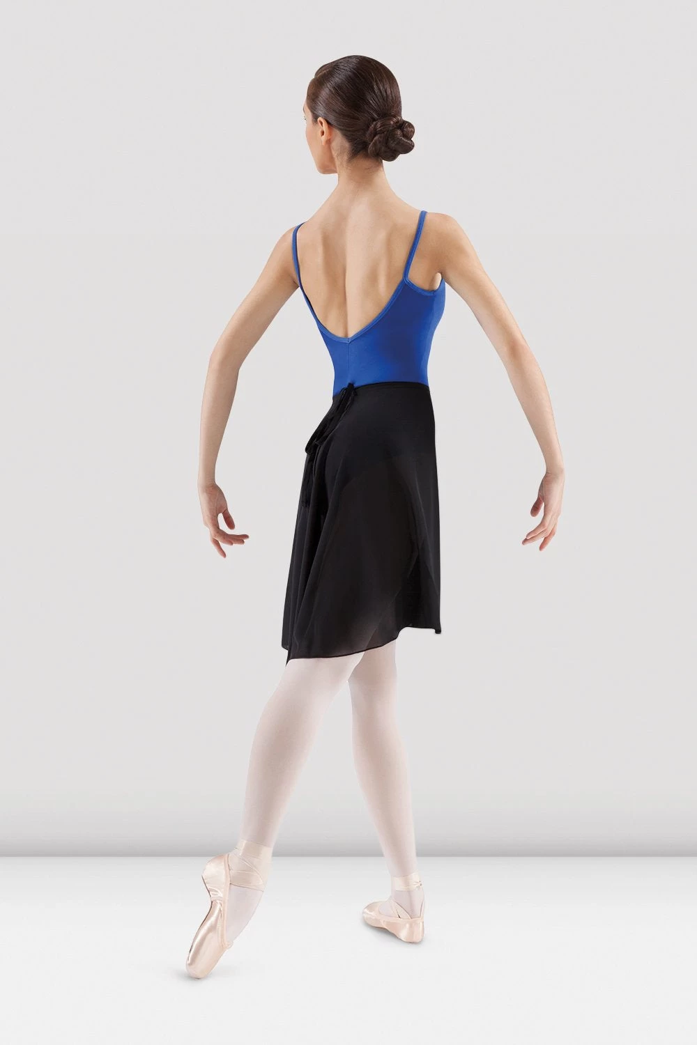 A classical style Georgette skirt which falls softly to the knee, crosses over at the front of the body and ties neatly at the back. This skirt is a beautiful length for teachers to wear to class, as well as students studying variations that require a longer length skirt for movement. Available in basic black, you can pair it with a black leotard or a different colour for a contrasting look.